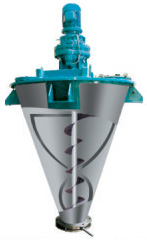 產品概述:由擺線針輪減速機連接中心螺桿及外層螺帶以相同轉速轉動。工作時,中心螺桿將混合物料由底部提升到頂部,同時線速度較大的外部螺帶將物料由下而上沿錐形筒壁盤提升,二種運動在離心力作用下又將物料沿切線方向拋向空間,物料產生強烈的對流剪切、擴散,從而達到快速混合的目的。(螺桿也可做成反向螺桿)。